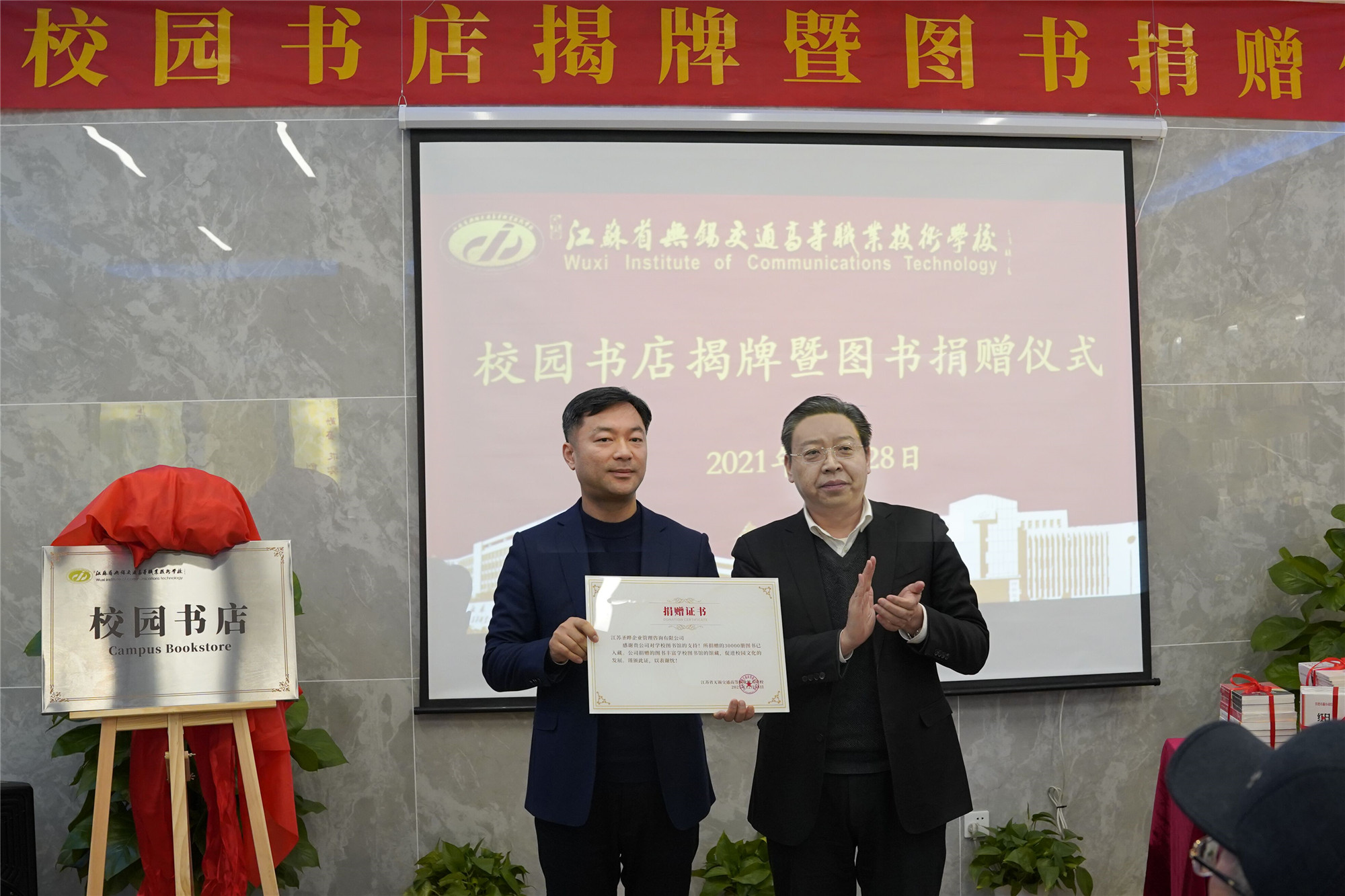 仪式上,夏成满书记、李虎书记和芮郡总经理共同为校园书店揭牌。李虎书记代表学校接收捐赠并颁授捐赠证书。学校倪依纯副校长汇报了校园书店的建设及运营情况,芮郡总经理就校园书店规划建设的理念和实施情况做了介绍。此次捐赠仪式中,江苏圣晔企业管理咨询有限公司为学校图书馆捐赠了纸质图书3万册,价值人民币80万元,丰富学校纸质图书资源,支持了学校图书馆建设。