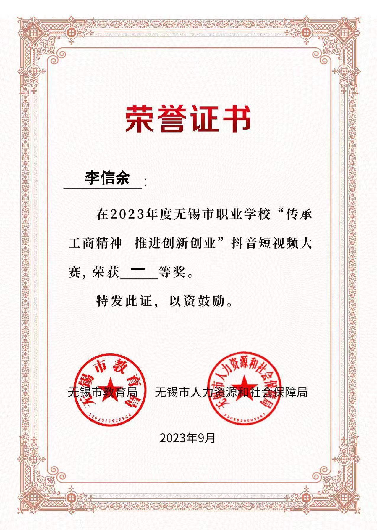 近日,2023年度无锡市职业学校“传承工商精神 推进创新创业”抖音短视频大赛中学校机电工程学院221341班学生李信余提交的短视频作品《传承与弘扬无锡工商业精神》脱颖而出荣获一等奖!