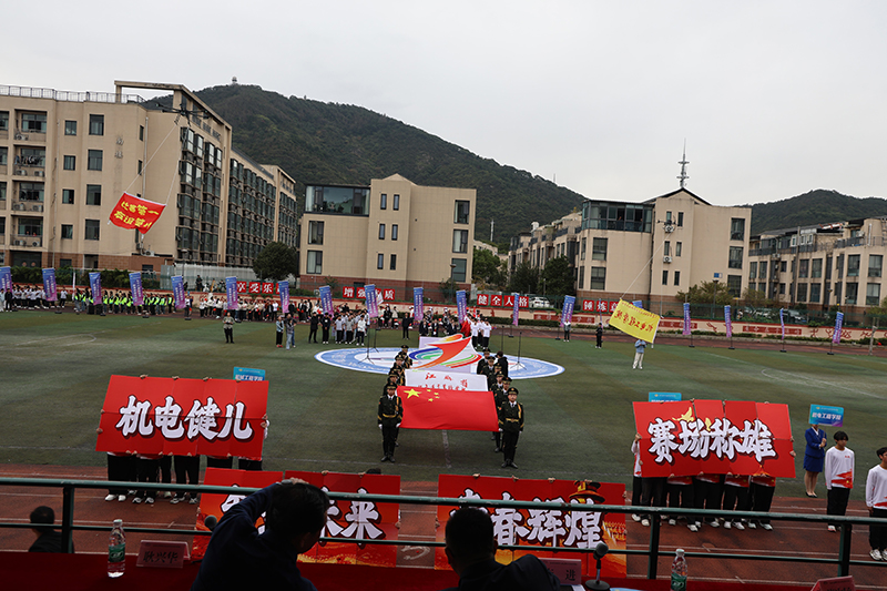 开幕式上,激昂的《运动员进行曲》响彻校园,各学院运动员方阵依次登场。机电工程学院学子迈着整齐铿锵的步伐,高举“机电工程学院”的鲜艳旗帜,眼神坚定、气势昂扬,用饱满的精神状态展现新时代学子的蓬勃朝气,身后操场上无人机方阵瞬间升空,登场瞬间便赢得全场阵阵欢呼,为后续比赛奠定了“敢闯敢拼”的基调。