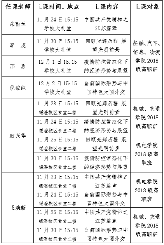 为深入贯彻中共中央宣传部教育部印发的《新时代学校思想政治理论课改革创新实施方案》文件精神,落实校领导进思政课堂,本学期将开展2018级高职《形势与政策》课程教学,具体上课安排如下: