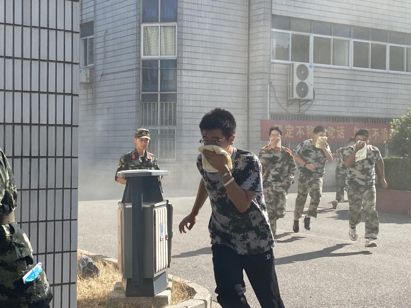 伴随着尖厉的火灾警报声,黄白色的烟雾腾空而起,消防演练拉开了帷幕。教室里的学生在疏散老师的指挥下,手捂着湿毛巾,分东西两侧楼道,按照预先设定好的路线快速、有序撤离,到达操场集中。整个过程用时3分多钟。