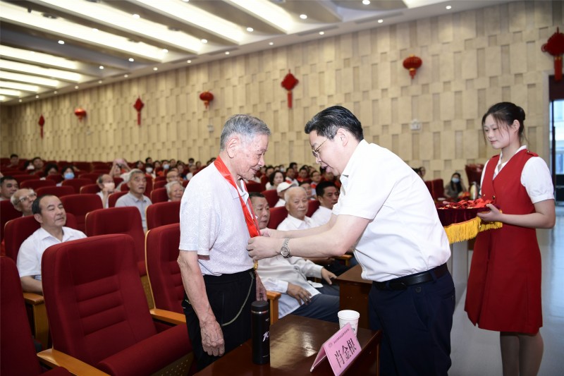 在热烈的掌声中,校党委书记校长李虎“光荣在党50年”的老党员代表颁发了纪念章,青年党员代表为他们献花,表达敬意之情