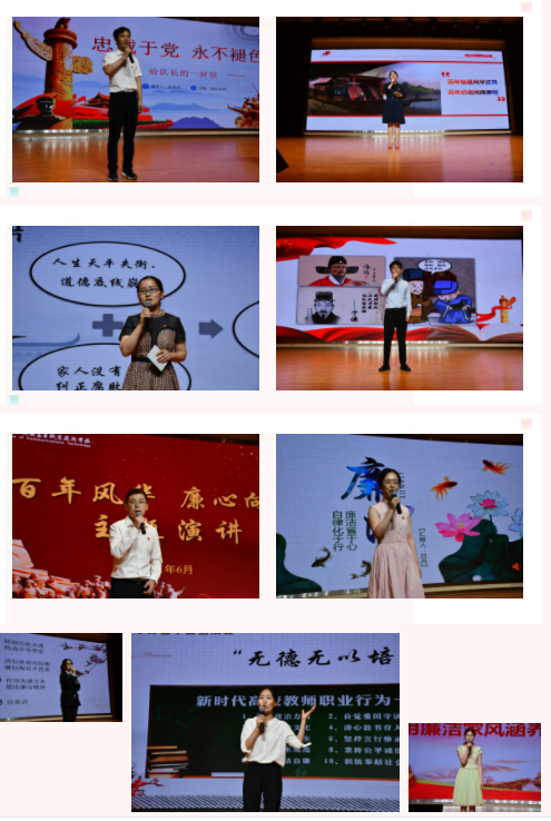 本次演讲比赛由学校各党总支(直属党支部)推荐的19位师生参加。参赛选手们围绕党史学习、党风廉政建设、师德师风建设、好家风故事、中国精神等,立足岗位、紧扣主题,以真挚的情感、流畅的语言,声情并茂地讴歌了党、讴歌了祖国,赞颂了中华优秀儿女的优良作风和良好家风,展示了学校教师坚守师德、廉洁从教的精神风貌,诠释了忠诚、廉洁、担当的重要意义和历史使命。经过激烈地角逐,比赛最终评选出一等奖2名,二等奖4名,三等奖6名,优秀奖7名。