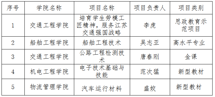 近日,无锡市教育局公布了《关于公布无锡市职业教育质量提升攀登计划2021年度重点项目( 第一批 ) 名单的通知》(锡教高职发﹝2021﹞5号),我校9个项目入选:《培育学生劳模工匠精神 服务江苏交通强国战略》项目认定为思政教育示范项目;李维财、朱金丰、张文卓、奚鑫等4名同学认定为技能雏鹰;船舶工程技术专业认定为高水平专业;公路工程检测技术课程认定为职业教育金课;《电子技术基础与技能》和《汽车运行材料》认定为职业教育新型教材。