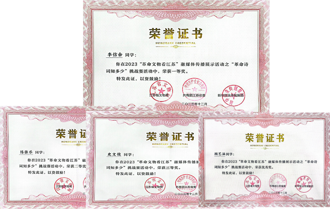 “革命文物看江苏”融媒体传播活动开展以来,学校深入贯彻落实习近平总书记关于革命文物工作重要指示精神,邀请专家走进学校开展“强国公益·革命诗词进校园”活动,推广江苏革命文物。组织学生参加“革命文物看江苏——革命诗词知多少”挑战赛活动,经前期线上网络比赛,4名学生脱颖而出,参加线下总决赛,并取得优异的成绩。学校机电工程学院学生李信余在“革命诗词知多少”挑战赛总决赛中获一等奖,交通工程学院学生陈张乐,汽车工程学院史文俊,船舶工程学院顾艺涵分别获二、三等奖和优秀奖。