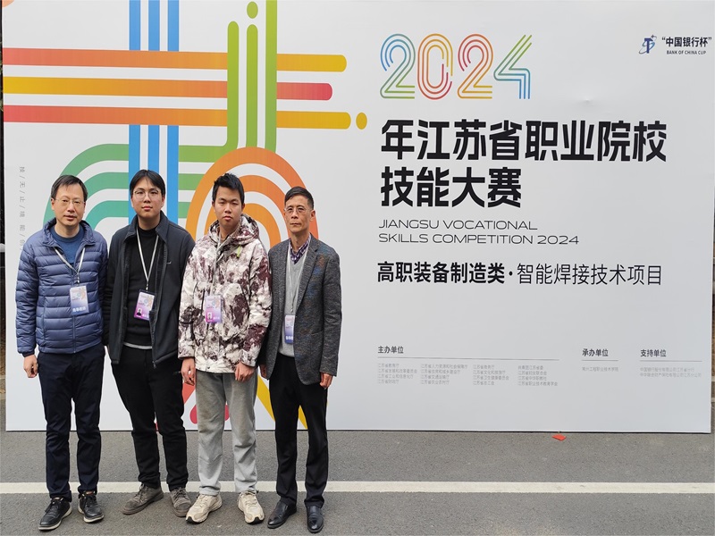 智能焊接技术高职组赛项系江苏首次举办,要求在5个小时的比赛中完成焊接理论知识、手工焊接、机器人焊接三个模块的考核,非常考验选手对焊接理论知识的掌握和实践技能的综合应用能力。寒假初期,参赛选手和指导老师一接到通知就投入紧张的备赛,在学校及学院各级领导的关心支持下,他们克服时间紧、任务重等困难,冒着严寒认真开展集训,坚持训练到过年前3天,大年初十又返校开始集训。面对比赛前不久才安装到位的焊接机器人和焊机等设备,师生们迎难而上,齐心协力,共同研究制订焊接工艺,不断调试修改参数,在指导老师陪伴下,选手们每天从早上一直训练到晚上,不断练就过硬的技术。比赛中,他们沉着应对,规范操作,展现出扎实的基本功和娴熟的专业技能。