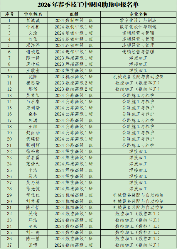 为培育和践行社会主义核心价值观,进一步发挥榜样的引领示范作用,营造良好的班风学风,引导学生健康成长,根据无锡市人力资源和社会保障局《关于做好全市技工院校2026年春季学期中职免学费、国家助学金申报的通知》的文件精神,经各学院组织申报,学生工作处组织评审,拟推荐2024数制中级1班彭诚诚等37人申报2026年春季技工院校国家助学金。