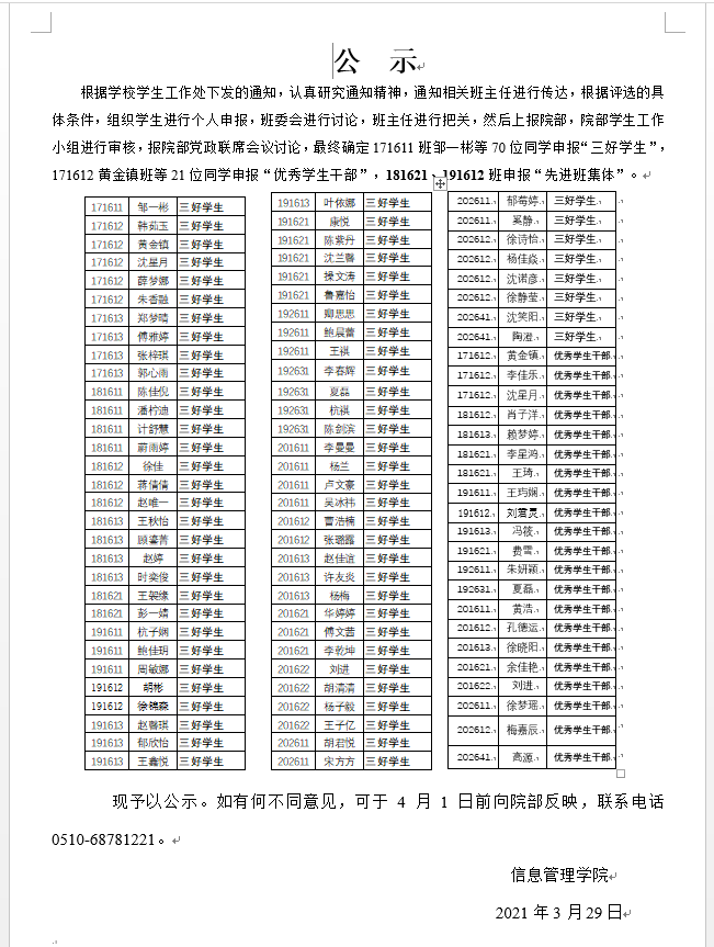 公示:2020年度三好学生、优秀学生干部等荣誉