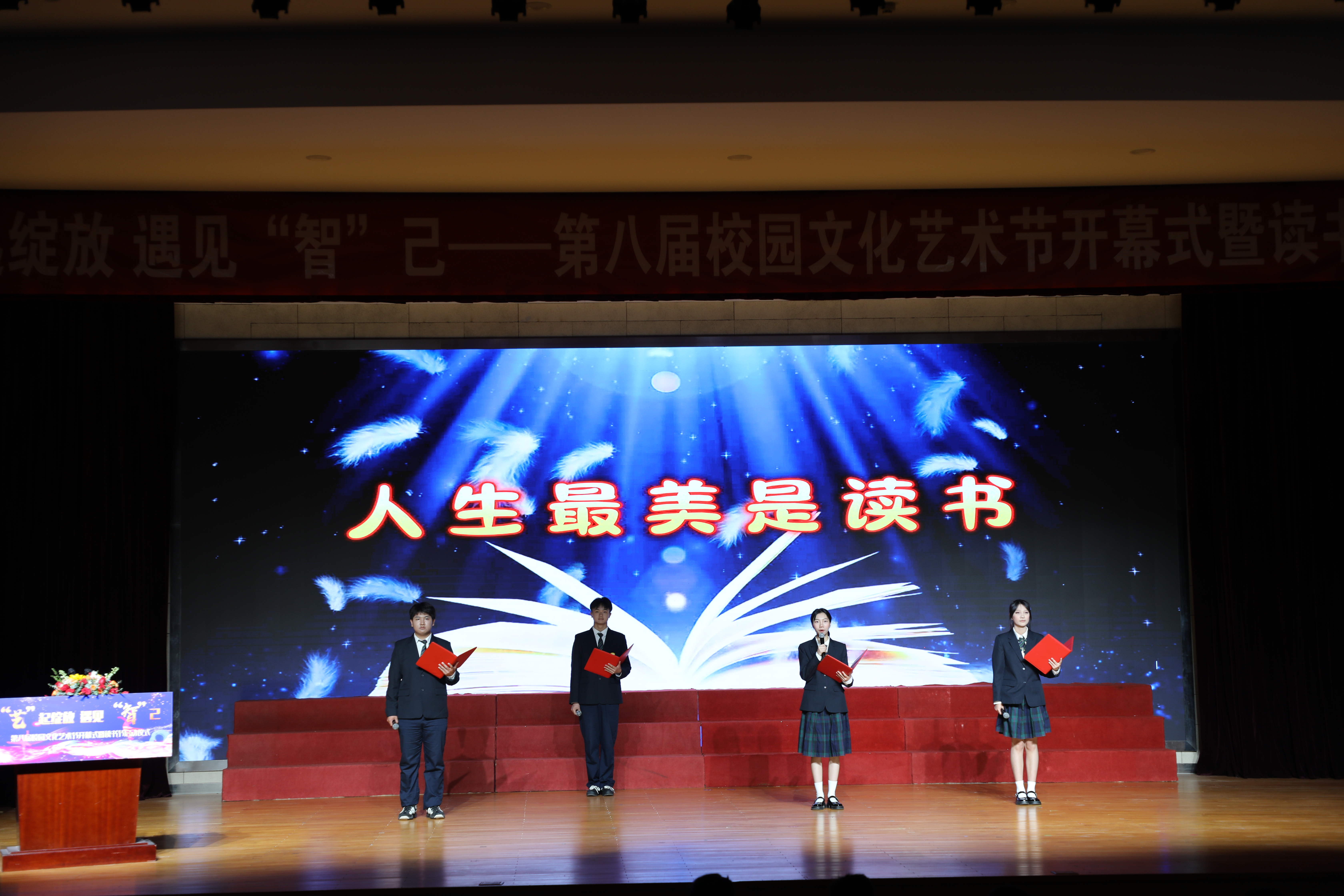 书香启智,阅读点亮成长之路。2025 年读书节以“书香漫溢 智趣共生”为主题同步启动,包含十多个阅读推广相关活动。活动伊始,学校党委书记、校长李进宣布:“第八届校园文化艺术节暨读书节正式开幕!” 现场掌声雷动,气氛热烈。