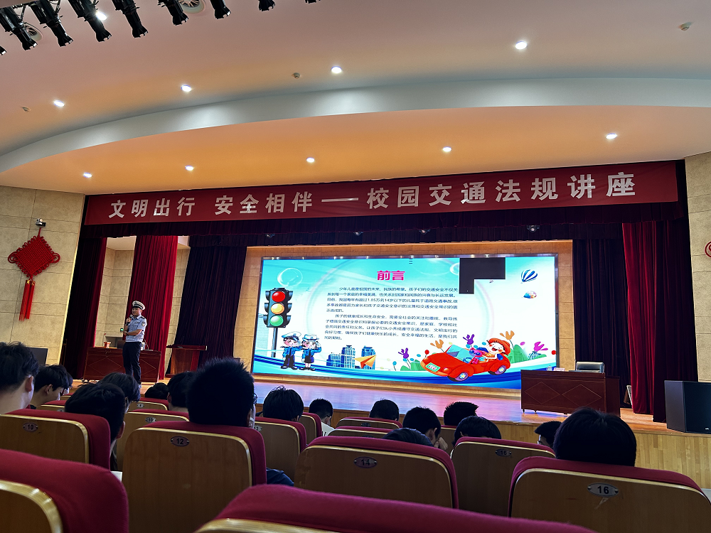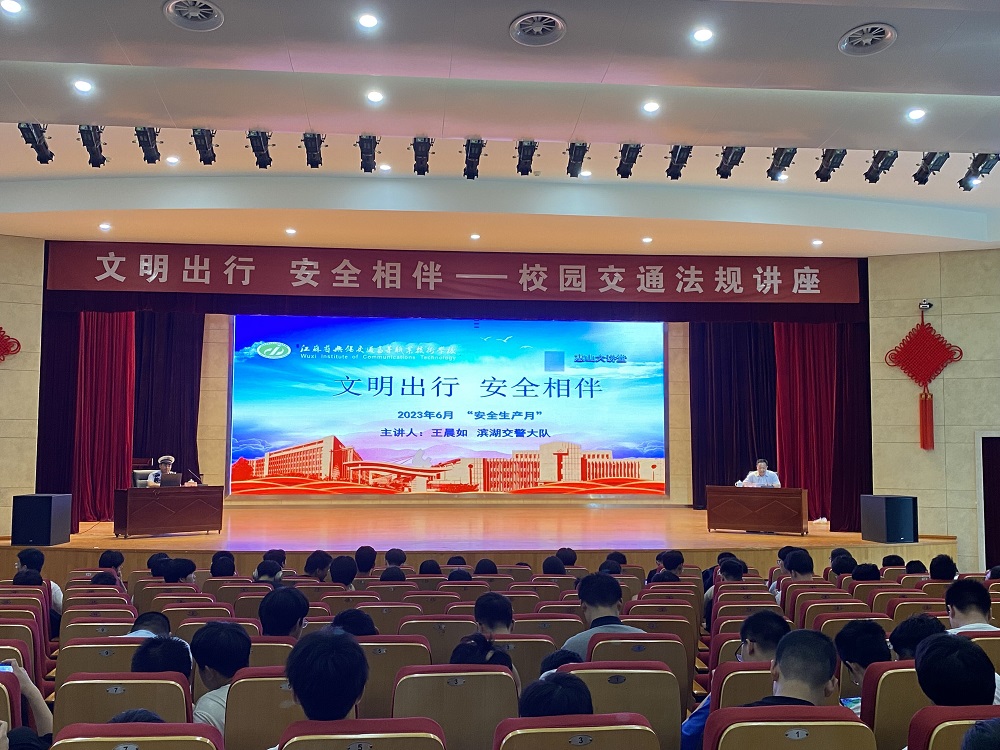 为提高广大师生的交通安全意识,增强自我保护能力,更好地宣传贯彻落实2023年“安全生产月”活动精神, 6月14日下午,安全保卫处牵头与无锡市滨湖交巡警大队在学校大礼堂开展了校园交通法规讲座。本次讲座邀请了滨湖交巡警大队王晨如警官专题宣讲,学校600余名学生代表参加聆听。