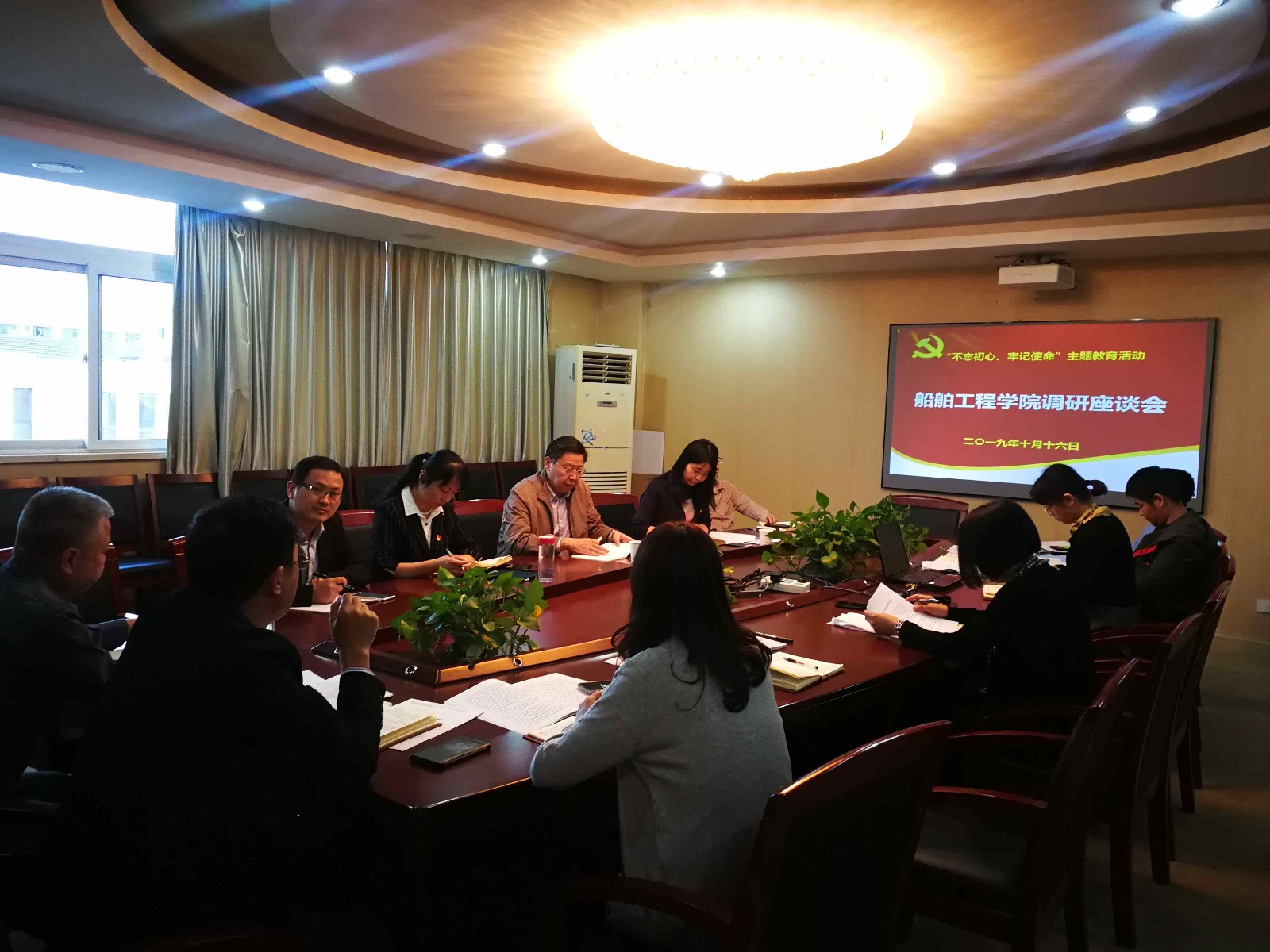 2019年10月16日下午,校党委书记李虎赴船舶工程学院开展“不忘初心、牢记使命”主题教育调研,教务处副处长冯美仙、组织人事处副处长邵敏珠陪同参加,船舶学院书记吴志亚、副院长刘方、综合办主任陈妍、党总支委员、党支部书记、教研室主任、辅导员和教学秘书等相关人员参加了座谈。