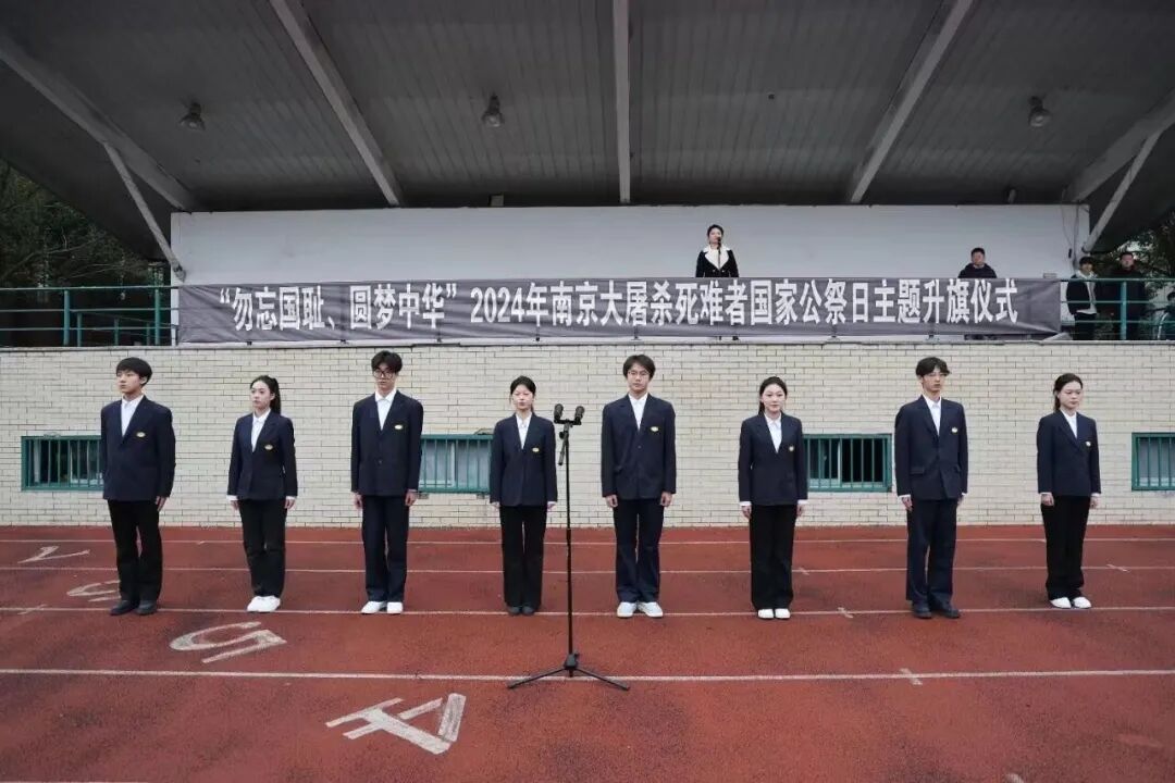 2024年12月13日,学校师生齐聚操场,举行“勿忘国耻,圆梦中华”——第11个南京大屠杀死难者国家公祭日主题升旗仪式,引导同学们铭记历史,珍惜和平,居安思危,砥砺前行。校党委委员、副校长王珏出席仪式并讲话,全校师生代表1500余人参加了升旗仪式。