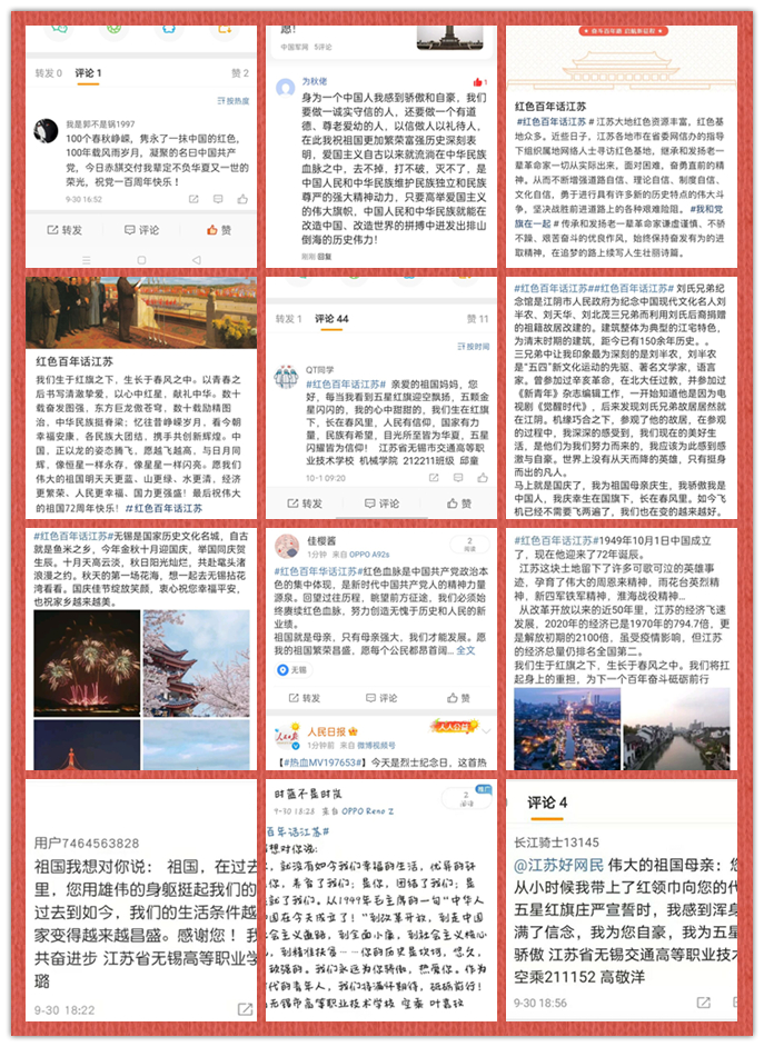 我在祖国怀里成长,我为祖国祝福。以网为媒,学生参与江苏自媒体联盟在微博等网络平台开设的“红色百年话江苏”话题活动把对伟大祖国的热爱和祝福在互联网上高高飘扬