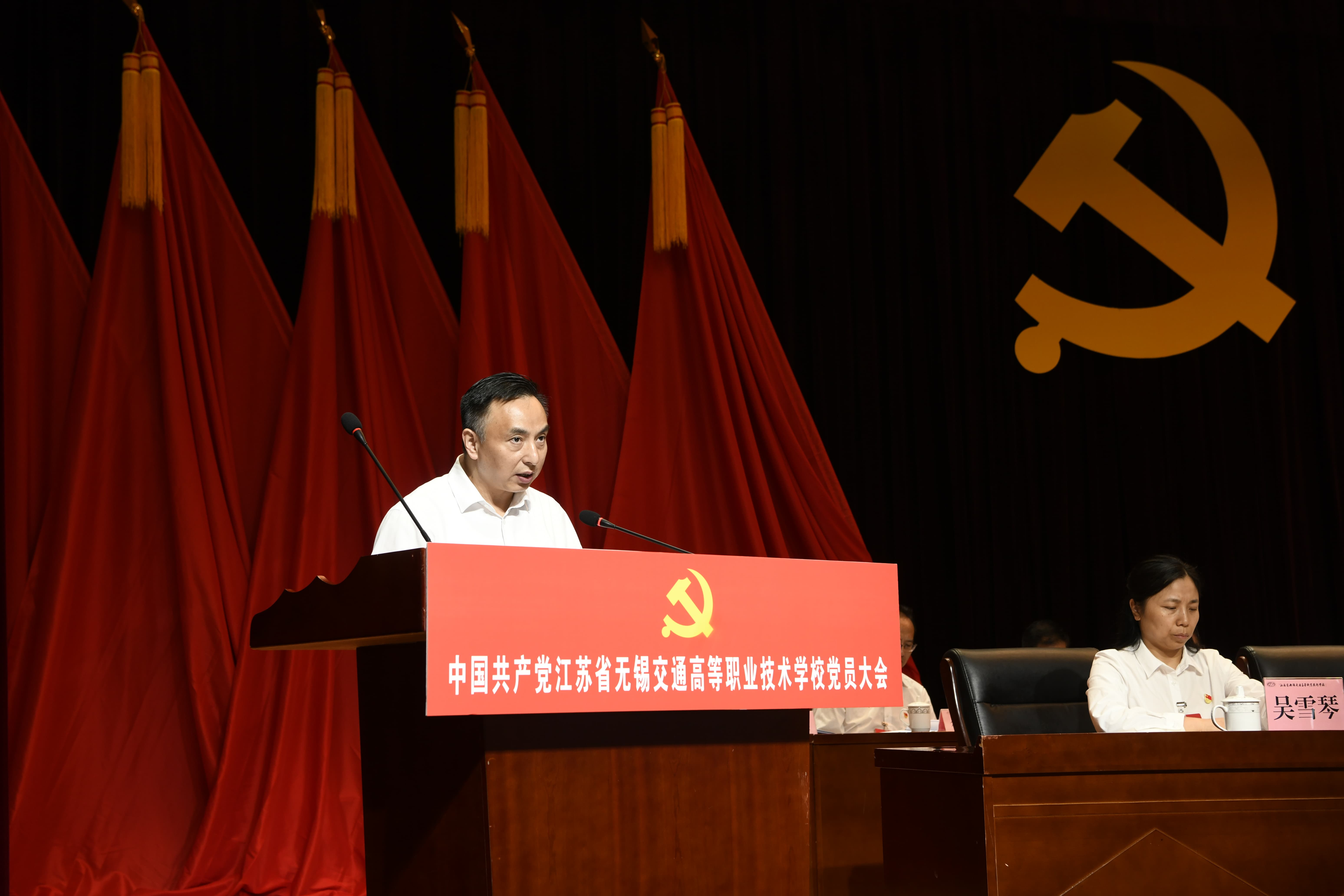 江苏省交通运输厅政治处处长、一级调研员金华对大会的召开表示热烈祝贺,向出席会议的全体人员致以诚挚的问候。他指出,2019年以来,学校党委在厅党组的坚强领导和无锡市委、市政府的关心支持下,坚持以习近平新时代中国特色社会主义思想为指导,认真履行管党治党、办学治校主体责任,全面贯彻党的教育方针,落实立德树人根本任务,充分发挥领导核心作用,持续深化教育教学改革,不断提升人才培养质量,为学校事业发展提供了坚强的政治保证和组织保证。他提出四点希望和要求:一是强化政治引领,坚定不移加强党的全面领导。二是聚焦立德树人,全面提高人才培养质量。三是坚持全面从严治党,营造风清气正的政治生态。四是加强领导班子建设,充分发挥事业领导核心作用。金华希望学校以本次党员大会为新的起点,深入学习贯彻习近平新时代中国特色社会主义思想,全面贯彻党的二十大和二十届二中、三中全会精神,全面落实省委、省政府决策部署,在厅党组的坚强领导下,在无锡市委、市政府的关心支持下,团结带领全体师生员工,不忘初心、牢记使命,踔厉奋发、勇毅前行,努力开创学校事业高质量发展新局面,为谱写“强富美高”新江苏现代化建设新篇章、为加快交通运输现代化示范区建设作出新的更大贡献!