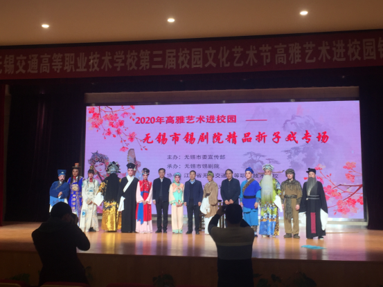 12月3日,由无锡市锡剧院带来的《薪火相传—锡剧精品折子戏专场》在学校大礼堂上演。此次演出的三部戏是由国家一级演员小王彬彬,中国戏剧“梅花奖”获得者王建伟导演的。演出剧目分别为《徐策跑城》《义侠记·戏叔》《杀狗劝妻》这三部经典锡剧非遗传承作品。全校700名左右师生一同观看了此次演出,参加本次江苏省交通政工理论研究专业委员会年会暨优秀政研成果分享会的领导专家也观摩了演出活动。