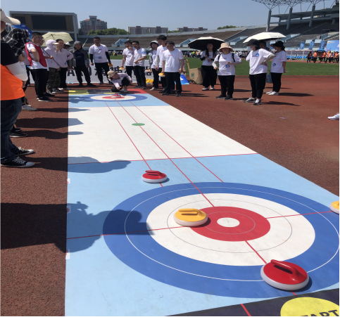 (图为:我校教职工代表队旱地冰壶比赛剪影)