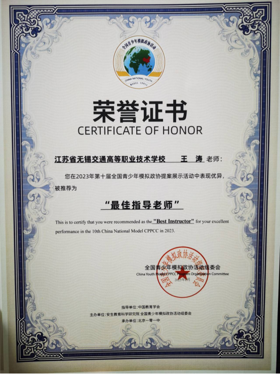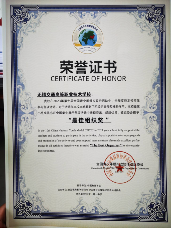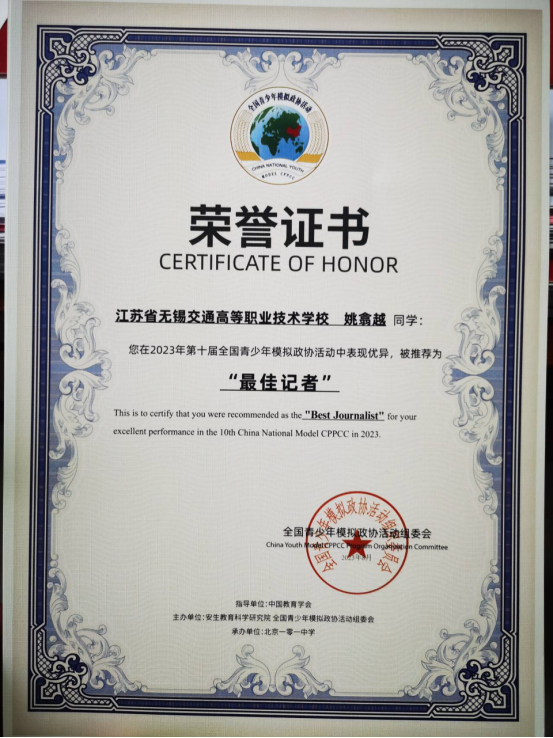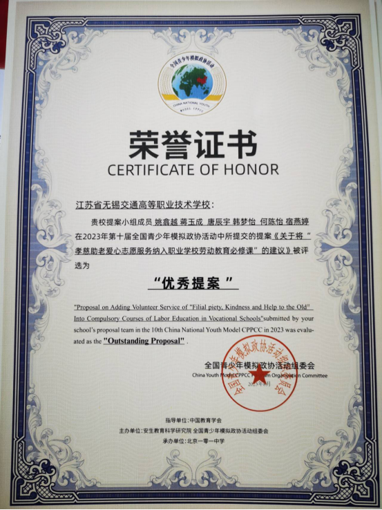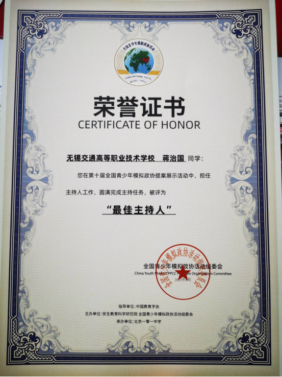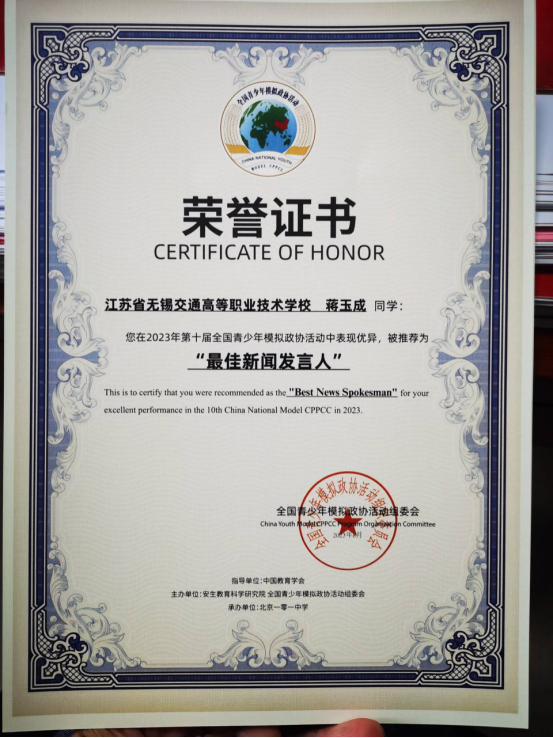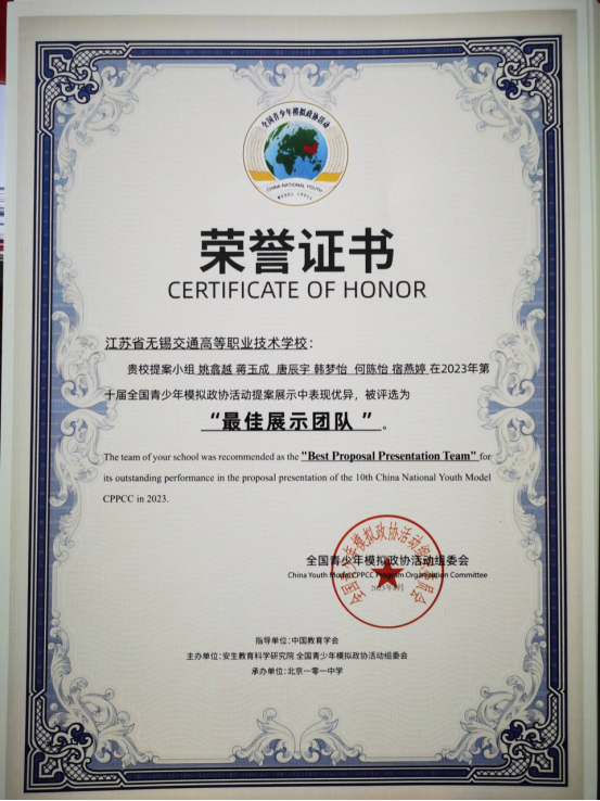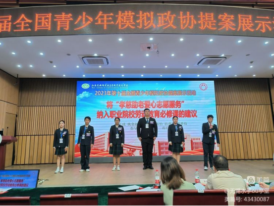 由蒋玉成、姚翕越、唐辰宇、韩梦怡、何陈怡、宿燕婷等青年学生组成的“模拟政协委员”小组,展示“将孝慈助老爱心志愿服务纳入职业学校劳动教育的必修课”的提案,通过对政协委员履职方式和政协会议组织形式的模拟,近距离体验人民政协制度。小组成员制作了视频和PPT,从医疗、教育、科协、记者、妇联、经济不同领域围绕提案进行阐述。学生们积极回答评委提问,将视野从“学校小课堂”转向“社会大课堂”,他们对所选话题的调研深度、覆盖广度以及建议的精细度,得到了现场嘉宾、评委和老师的好评。学校荣获最佳展示团队、优秀提案奖和最佳组织奖三个奖项,蒋玉成荣获最佳领导力、最佳新闻发言人、最佳风采奖三个大奖,宿燕婷、姚翕越、何陈怡同学荣获模拟政协最佳委员,姚翕越还荣获最佳记者奖,王 涛、蒋治国两位老师荣获最佳指导老师,蒋治国老师还荣获最佳主持人奖,个人合计获奖10人次。