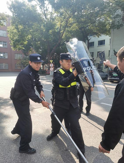 民警先是向学校安保工作人员讲解了防暴钢叉、盾牌、防暴棍等防护器械的正确使用技巧,并在现场对防护器械的使用方法进行演示,现场还对校方保卫人员器械使用中错误动作进行了纠正。器械使用培训后,民警又组织"暴徒"冲击校门的实例防暴演练,学校安保人员迅速反应、报警求助的同时,迅速形成多对一体作战体系,使用防卫器械将“暴徒”制伏。