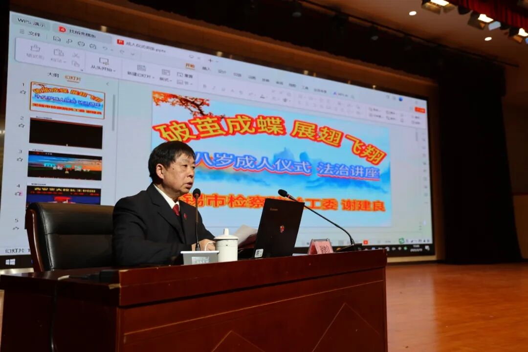 学校聘任无锡市检察院关工委法治宣讲员谢建良为校外法治辅导员,强化青少年法治教育,为成长保驾护航。最后,谢建良检察官以《破茧成蝶 展翅飞翔》为主题作精彩分享,从法治视角解析青年成长路径,鼓励学生突破舒适区,在时代浪潮中勇立潮头。