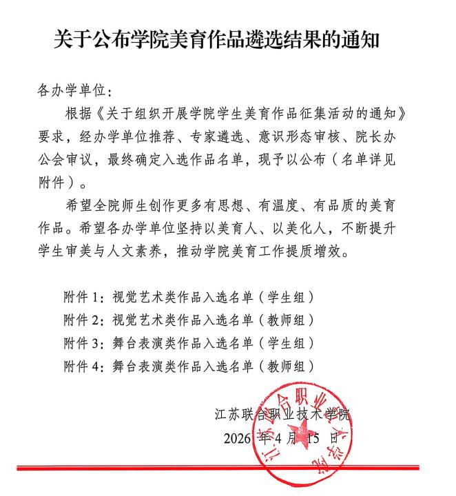近日,江苏联合职业技术学院公布2026年学院美育作品遴选结果,经学校推荐和江苏联院专家评审、意识形态审核及院长办公会审议,我校4件学生作品成功入选,充分彰显学校美育育人成效与学子艺术风采。