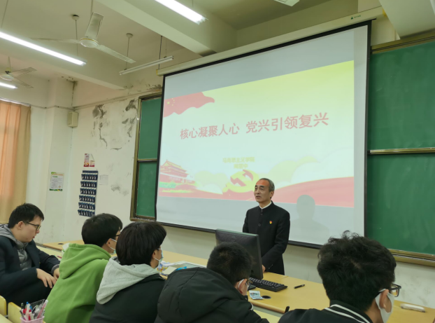 为了让我校师生深入掌握十九届六中全会精神内涵,进一步懂得中国共产党一百年来带领中国人民历经革命、建设、改革时期所取得的伟大成就以及中国共产党总结出来的宝贵历史经验,能够使广大师生牢记党的初心使命,强化责任担当,11月25日下午,马克思主义学院王龙生副教授和闻惠中副教授分别在弘毅楼508阶教和510阶教为钱荣校区六个学院的学生干部和入党积极分子宣讲了以“核心凝聚人心 党兴引领复兴”为主题的十九届六中全会专题讲座。讲座活动由基础教学部主任、马克思主义学院常务副院长陈建明和思政教研室党支部书记张海滨主持。