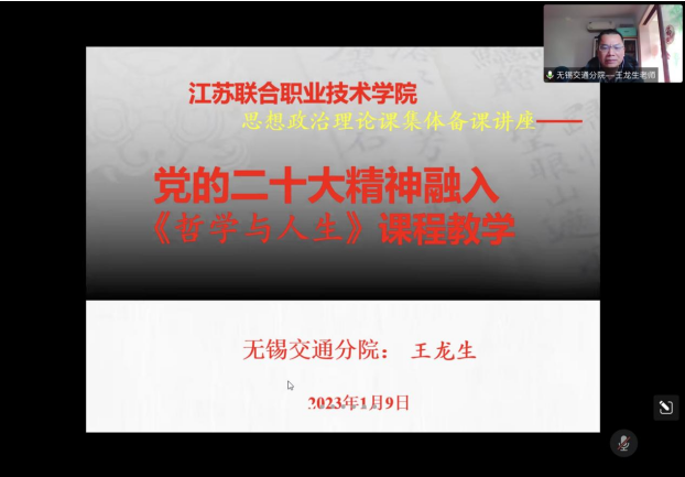 第二阶段由组内所有办学单位《哲学与人生》校级集体备课牵头人集体备课。无锡交通分院王龙生教授作题为“党的二十大精神融入《哲学与人生》课程教学”的专题讲座,各协作组代表就《哲学与人生》课程教学进行交流发言,张海滨副教授对下学期《哲学与人生》集体备课重点任务进行了部署。