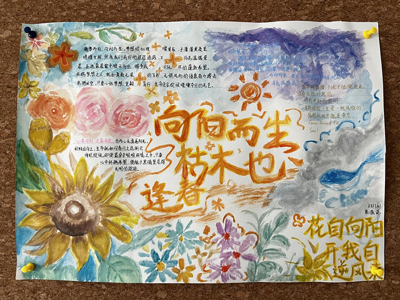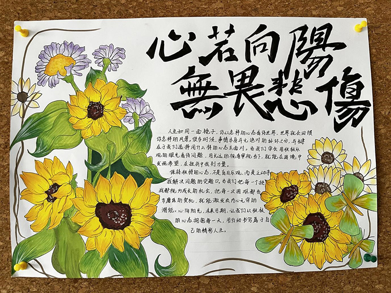 活动自启动以来,得到了机电工程学院同学们的积极响应。同学们围绕 “向阳而生”“心若向阳,无畏悲伤” 等心理健康主题,发挥创意与巧思,以细腻的笔触、丰富的色彩,将对心理健康的理解融入手抄报创作中。有的作品以向日葵为元素,传递积极向上、不惧困境的信念;有的通过文字与插画结合,科普心理健康知识、分享情绪调节方法 。