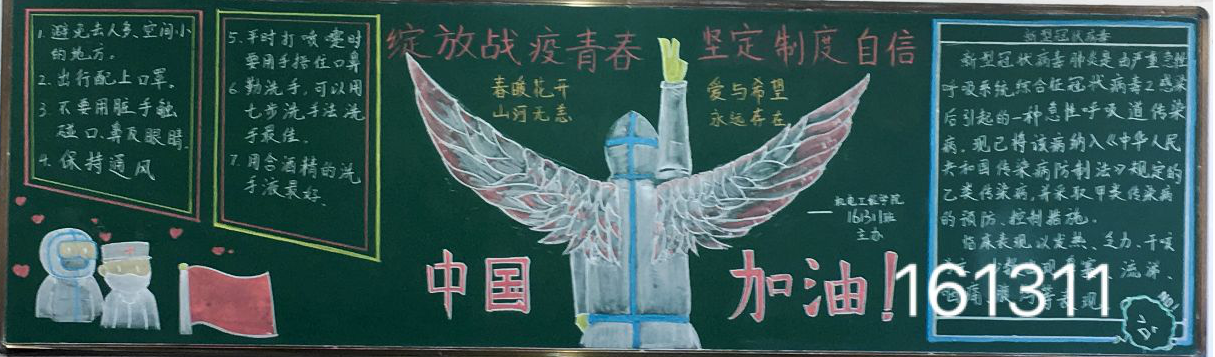 为全面打赢新冠肺炎疫情阻击战,做好抗疫知识宣传,513日,机电工程学院举办了以绽放战疫青春,坚定制度自信为主题的黑板报评比活动,此次活动共有18个班级参加。