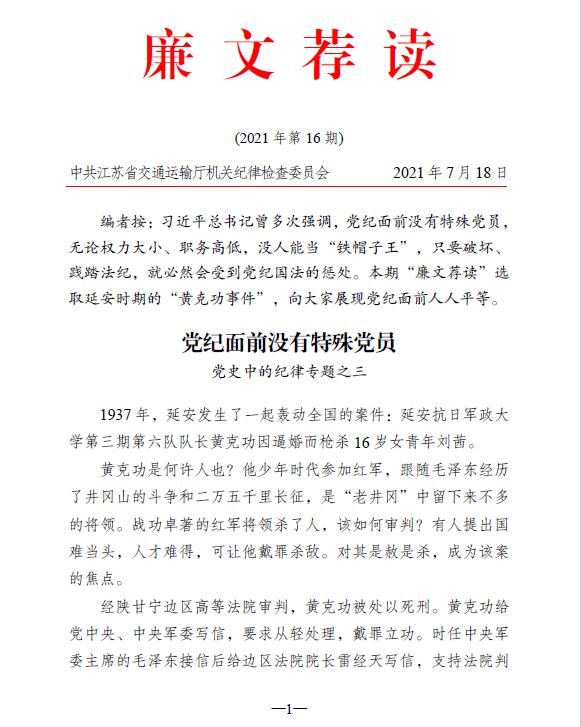 2021年廉文荐读第16期——党纪面前没有特殊党员