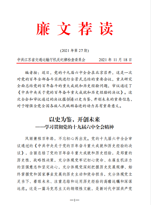 2021年廉文荐读第27期——以史为鉴 开创未来 学习贯彻党的十九届六中全会精神