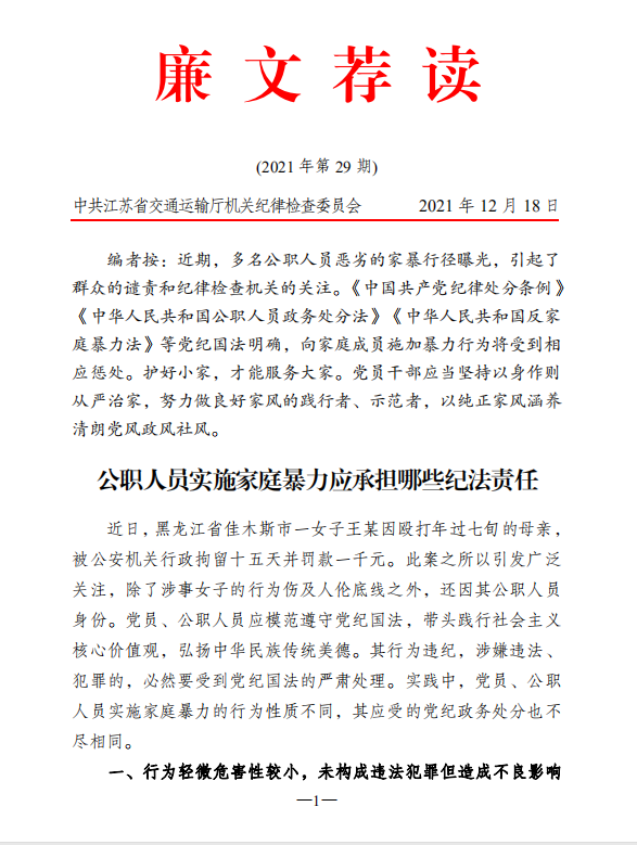 2021年廉文荐读第29期——公职人员实施家庭暴力应承担哪些纪法责任