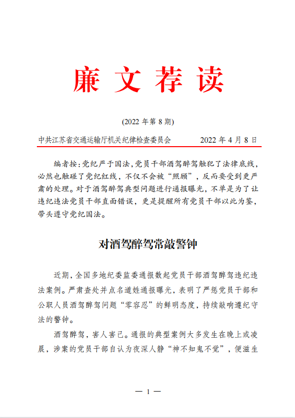 2022年廉文荐读第8期——对酒驾醉驾常敲警钟