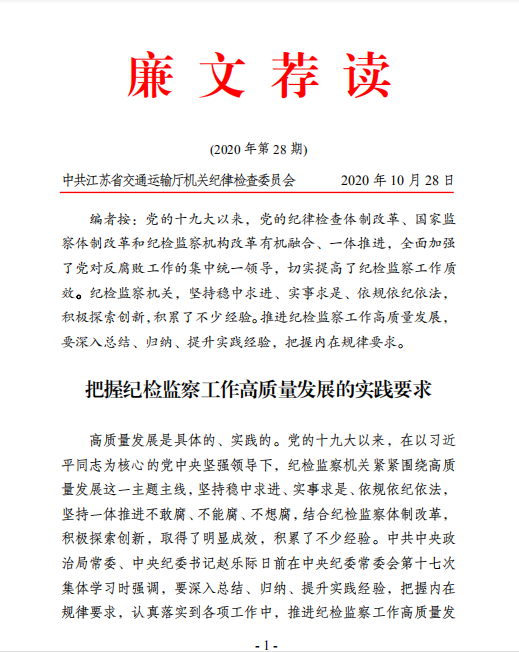 廉文荐读第28期——把握纪检监察工作高质量发展的实践要求