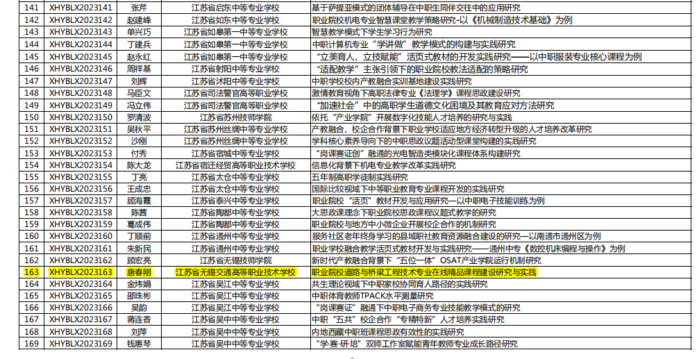 4月11日,江苏省职业技术教育学会印发《关于公布2023-2024年度江苏职业教育研究立项课题名单的通知》,公布2023-2024年度江苏职业教育研究课题立项,唐春刚主持的《职业院校道路与桥梁工程技术专业在线精品课程建设研究与实践》获批立项。