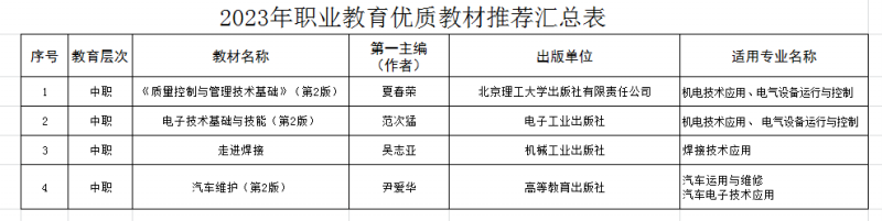 根据《省教育厅办公室关于做好2023年职业教育优质教材推荐工作的通知》(苏教办职函〔2023〕14号)通知要求,经各学院推荐、学校审核,拟推荐《质量控制与管理技术基础》等4本教材,参加江苏省2023年职业教育优质教材评选。
