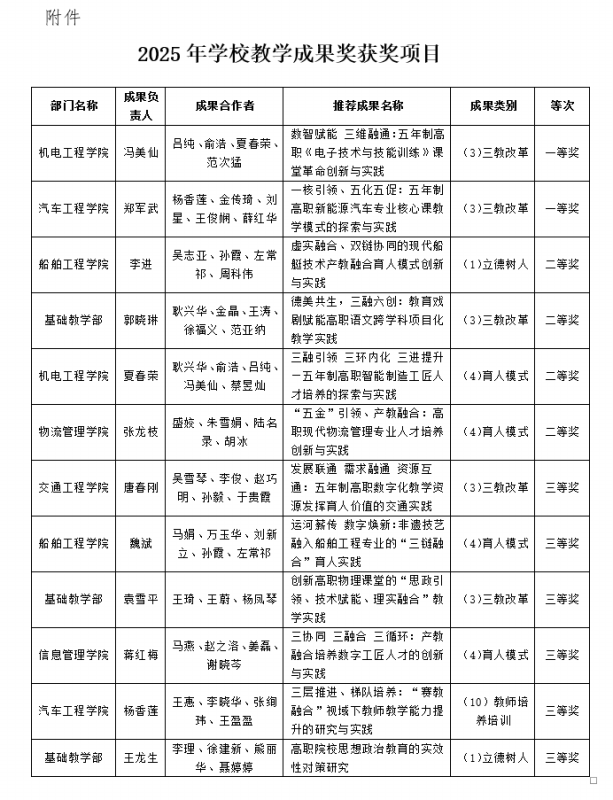根据学校《关于开展2025年教学成果奖评选工作的通知》,学校启动了2025年教学成果奖的申报工作,共收到各部门的申报成果12项。经教学工作委员会专家评审,校务会审定,《数智赋能 三维融通:五年制高职《电子技术与技能训练》课堂革命创新与实践》等2项成果为校级一等奖,《虚实融合、双链协同的现代船艇技术产教融合育人模式创新与实践》等4项成果为校级二等奖,《发展联通 需求融通 资源互通:五年制高职数字化教学资源发挥育人价值的交通实践》等6项成果为校级三等奖,现予以公示。
