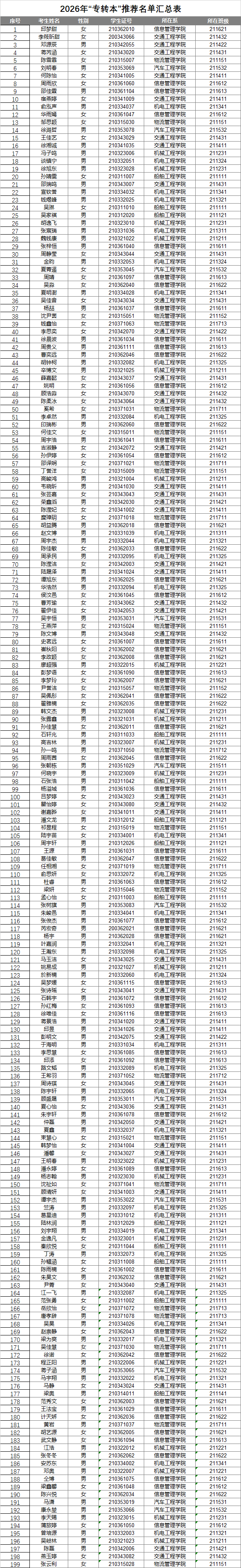 根据《省教育厅关于做好2026年五年一贯制高职(高师)“专转本”工作的通知》(苏教学函〔2026〕2号),及《省教育考试院关于印发江苏省2026年普通高等学校和五年一贯制高职(高师)“专转本”工作实施办法的通知》(苏教考成〔2026〕1号 ),我校开展了“专转本”报名推荐工作。经考生自愿报名、专职辅导员和任课教师推荐、学院初审、教务处审核等程序,最终有199名学生通过审核,拟推荐参加“专转本”考试,现将名单予以公示(具体名单见附件)。如对公示对象有异议,请以书面形式,并署真实姓名向教务处反映,公示时间为2026年1月12日—1月16日。