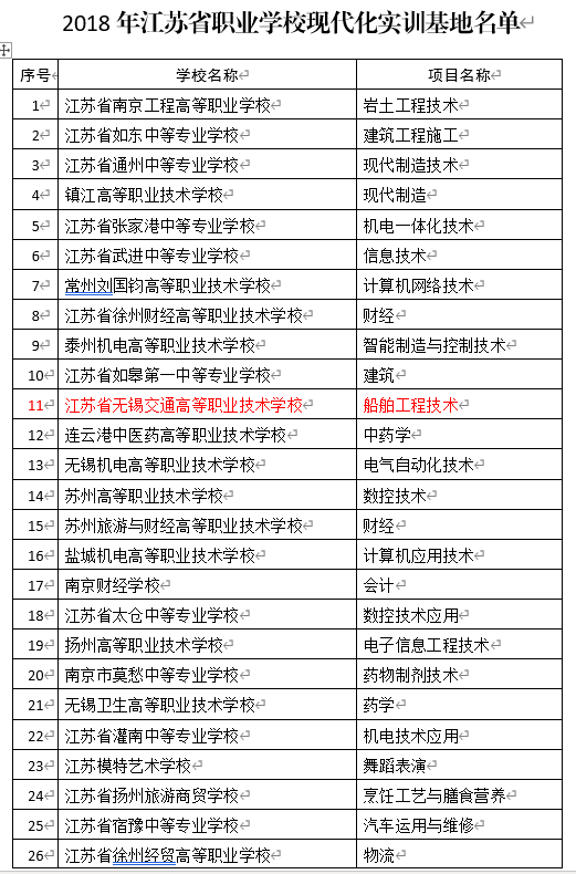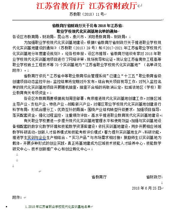 省教育厅省财政厅关于公布2018年江苏省现代化实训基地名单的通知