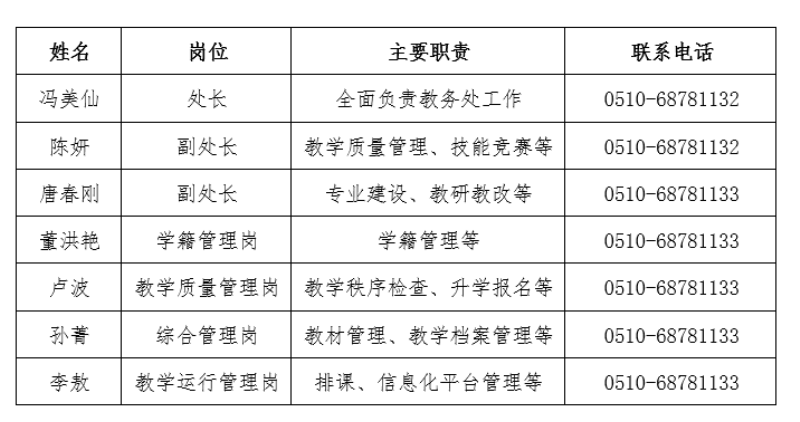 教务处是在校长和分管教学的领导指导下开展工作,是学校教学工作的组织、协调、管理的综合职能部门。主要负责制定学校教学工作计划、组织开展专业建设和教师业务考核评教活动、对二级学院(部)教研室进行业务指导;负责学生学籍管理、考务管理、技能竞赛管理、学生成绩管理,统筹协调中高职衔接立交桥及有关升学教育的工作,负责组织各类教学竞赛、师生技能比赛等工作。