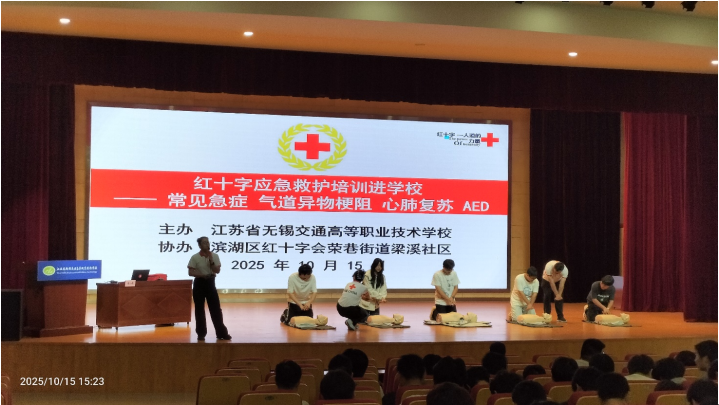 2025年10月15日,汽车工程学院在学校大礼堂举办了一场意义非凡的红十字应急救护培训。学院联合滨湖区红十字会荣巷街道梁溪社区特别邀请无锡市红十字会四星救护培训师蒋小燕老师,为学生们带来实用急救知识与技能。