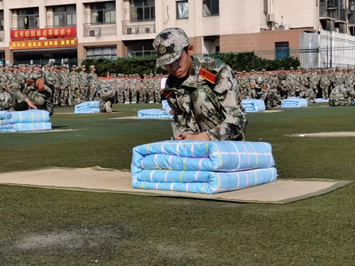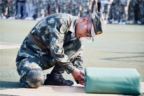 经过几天紧张的模拟训练,学生们都跃跃欲试,摩拳擦掌,一展风采。100名新生有序地来到操场,进行一场叠被子技能大比拼,伴随着口令,他们立即进入状态,迅速蹲下,铺平、压实、翻折、抠角、捏线,熟练地叠起被子,有的还以尺子予以辅助。