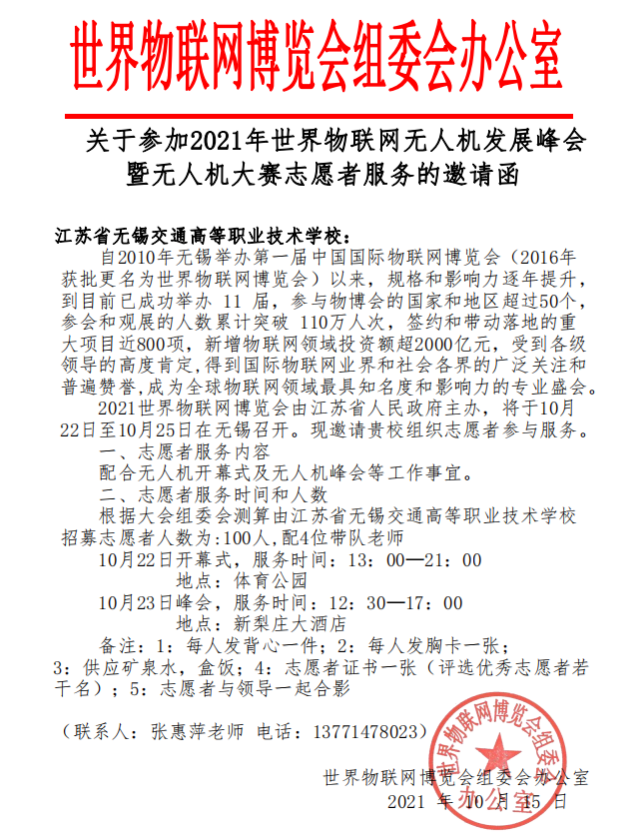 无锡交校志愿者服务2021世界物联网博览会无人机发展峰会暨无人机大赛 彰显青春风采
