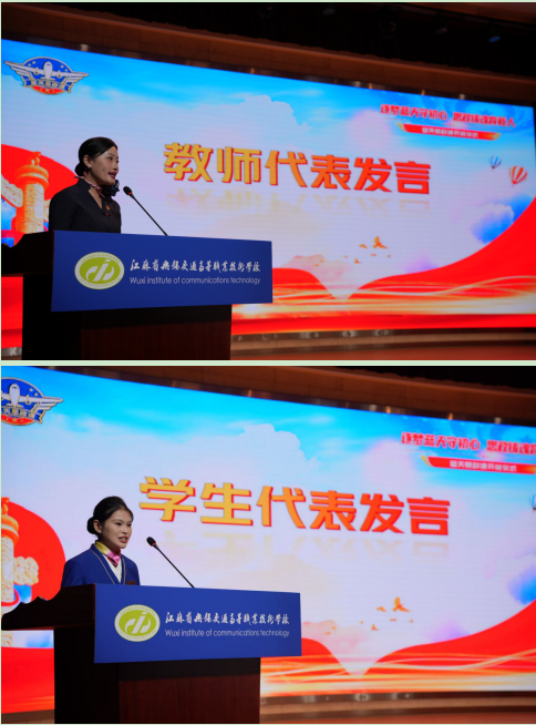 学生代表杨紫燕分享了自己的逐梦历程。凭借对专业的执着追求,她在江苏省职业院校技能大赛中荣获二等奖,获评无锡市“技能雏鹰”称号。暑期在瑞丽航空的实习经历与多场志愿礼仪服务,让她深刻体会到民航服务的温度与责任。她表示,蓝天思政课的开设为逐梦之路点亮了明灯,未来将牢记誓言,把思政学习成果转化为专业精进的动力。