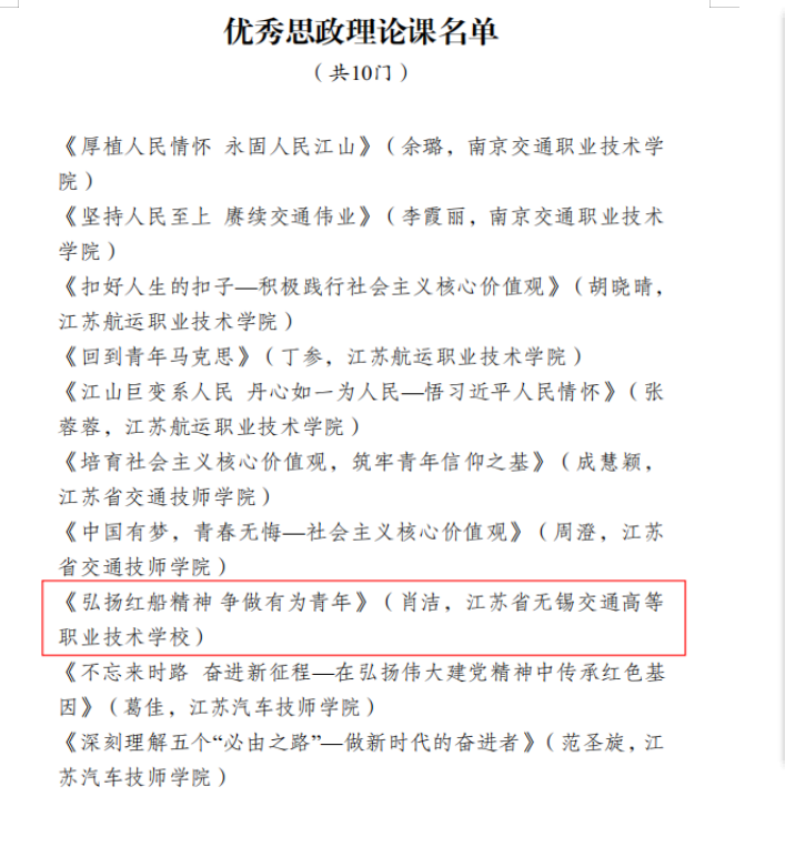 近日,马克思主义学院教师肖洁作品《弘扬红船精神 争做有为青年》获评江苏省交通运输厅优秀思政理论课,肖洁老师被授予“优秀思政理论课教师”称号。