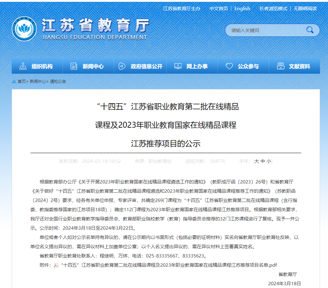 近日,江苏省教育厅公示了“十四五”江苏省职业教育第二批在线精品课程及2023年职业教育国家在线精品课程江苏推荐项目名单,学校2门课程被确定为“十四五”江苏省职业教育第二批在线精品课程,2门课程为2023年职业教育国家在线精品课程江苏推荐项目。
