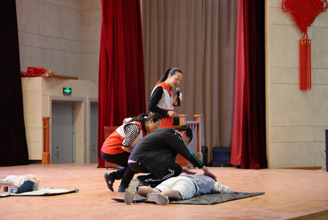活动初始,红十字会培训老师向师生们介绍了红十字会的起源发展、工作职责、标志及“人道、博爱、奉献”的红十字会精神,使同学们对红十字会有了初步了解。随后,红十字会培训老师结合理论知识和实际救护技巧对生活中遇到突发状况急救、徒手心肺复苏、溺水紧急救护等内容作了详细的讲解。为了使师生们更加深入的了解各项救护技巧、掌握心肺复苏要领、培训老师和师生们在现场展开了深入互动,对心肺复苏进行了实操演练、手把手向同学们传授了急救手法和注意事项。