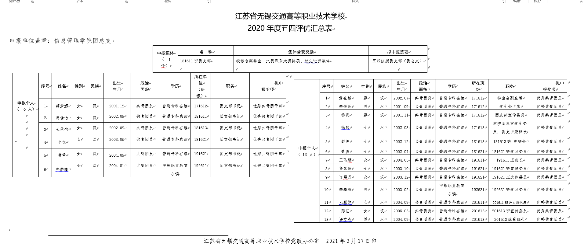 优秀共青团、共青团干部、红旗团支部公示