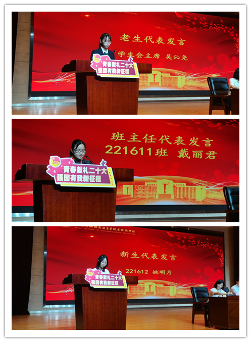 开学典礼在国歌声中拉开帷幕。首先是新生班兼职辅导员助理聘任仪式,蒋红梅副院长向他们表达了祝贺与期望,希望他们能够关爱学生、关注学生,谨言慎行,作为学生干部,能够向学生传达正能量,做好新生班级建设工作。新生班班主任代表戴丽君老师的发言,让新生们坚定了自己的奋斗目标,也更加清晰地认识到作为新时代中国青年身上所肩负的责任。老生代表学生会主席吴沁尧分享了自己的在校感悟与生活经验,为新生们往后进入社会、奉献社会打下了坚实的基础。新生代表221612班姚明月上台发言,她表示要努力学习、提升自我,励志为同一届学生树立一个优秀的学习榜样。郑智飞院长为优秀的新生代表颁发书籍盲盒,表现出学院对2022级新生的激励与关怀。最后是党委委员、纪委书记邢勇从持续学习、保持韧劲、团结合作和爱惜自己四个方面,充分向学生说明了学习的重要性,不仅要提升能力,更要提升素养,充分展现出学院深厚的文化底蕴及光明的未来。