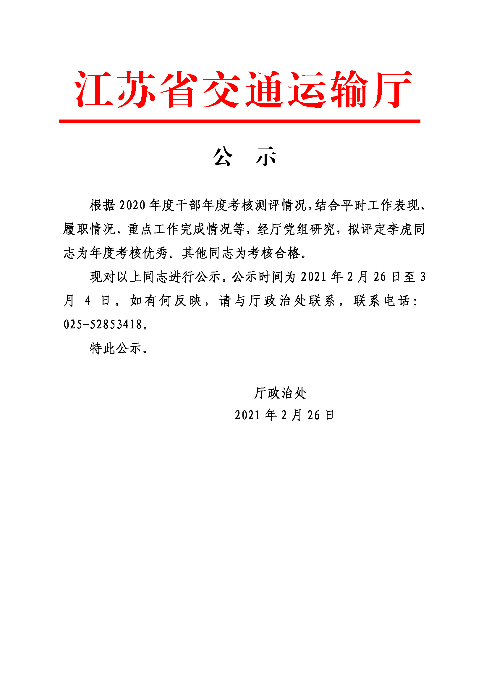 2020年度考核优秀等次人员名单公示