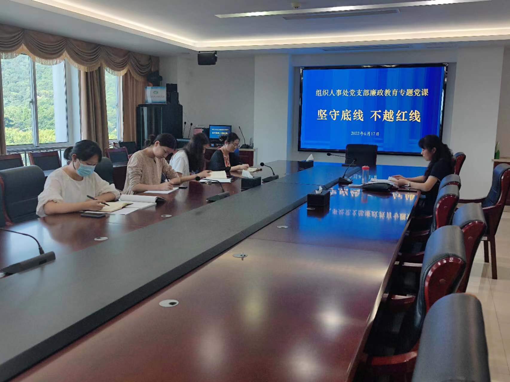 为抓实推进廉政警示教育月活动,深入贯彻落实中央八项规定精神,筑牢党员干部拒腐防变的思想防线,2022年6月17日,组织人事处党支部书记邵敏珠为支部全体党员作了《坚守底线 不越红线》 廉政专题党课授课。